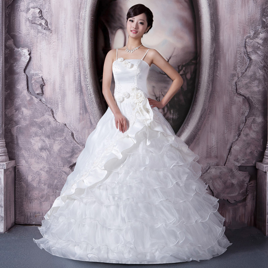吊带婚纱概括起来有以下几大优点:一:起到保护作用,很多胸部过于丰满的新娘,如果不使用吊带的话,抹胸有时很难包的住双锋,一不小心会脱落,使用吊带就无须担心这些了。二:装饰作用。吊带有单吊带有双吊带,有简洁线条也有复杂的花朵式的,点缀您的婚纱。