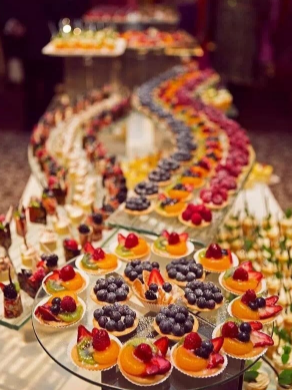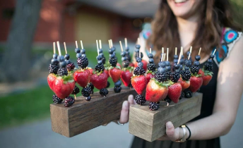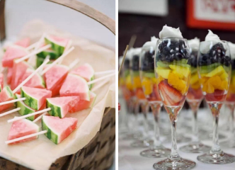 觉得水果自助不够精致的话,那就切成小块,串成彩虹一般的水果串吧~色彩缤纷的水果串,绝对是让大小朋友都尖叫的可爱。放在高脚杯里,也很不错呢~