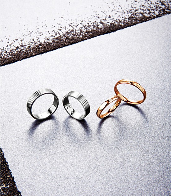 对戒的整体设计是精巧的设计和摩登风格的完美结合。戒身精细地刻着斜体的形式的签名。