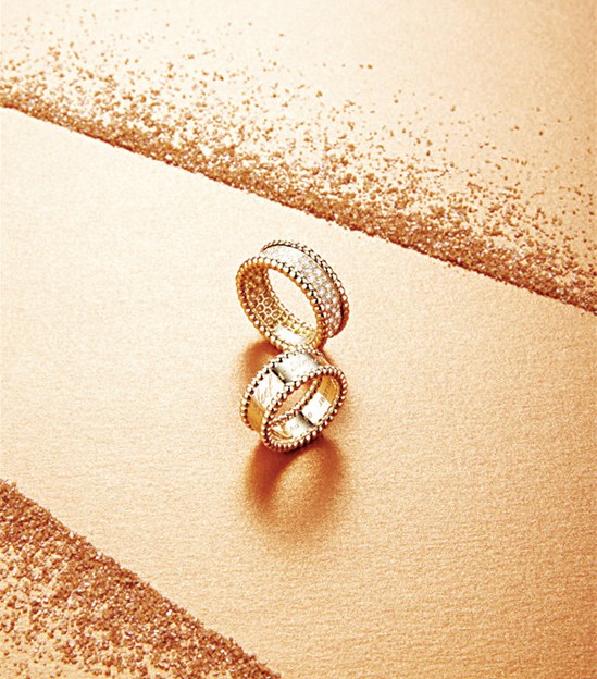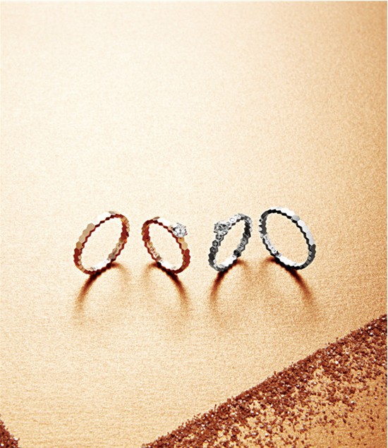 法国著名珠宝品牌CHAUMET尚美巴黎,六角形蜂窝设计图案戒指收藏是尚美巴黎原创性的一瞥。粉红色,白色,黄色金带镶有明亮式切割的钻石精心的设计,从一个简单的带环设计由九个环,可以产生无穷的层次感