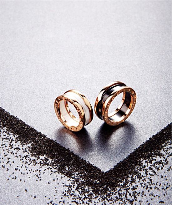宝格丽对戒的特色形状是机车的零件。戒环形状保留了现代风格的精致,玫瑰金与白色或黑色相匹配的陶瓷。