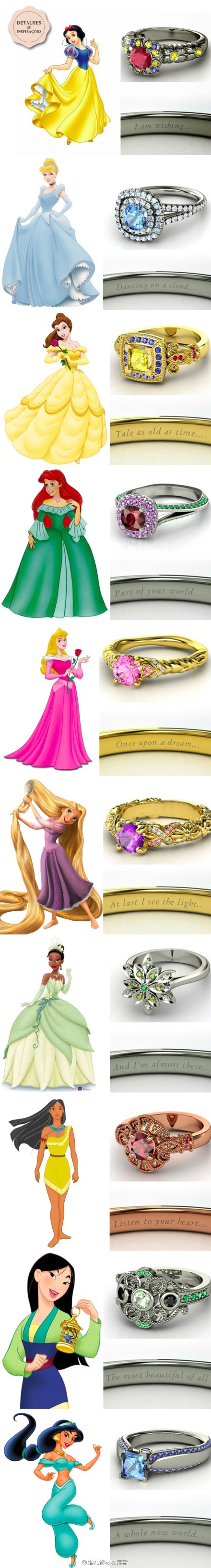 白雪公主,贝儿,小美人鱼,睡美人等等迪士尼的公主主题婚戒亮相,设计师根据每位公主的造型设计出相呼应的戒指,实在令人爱不释手!